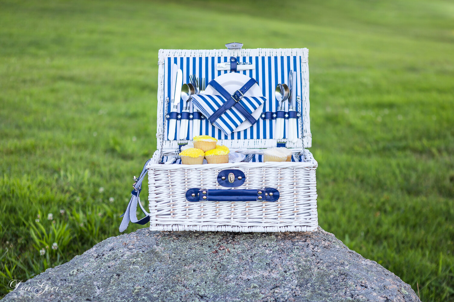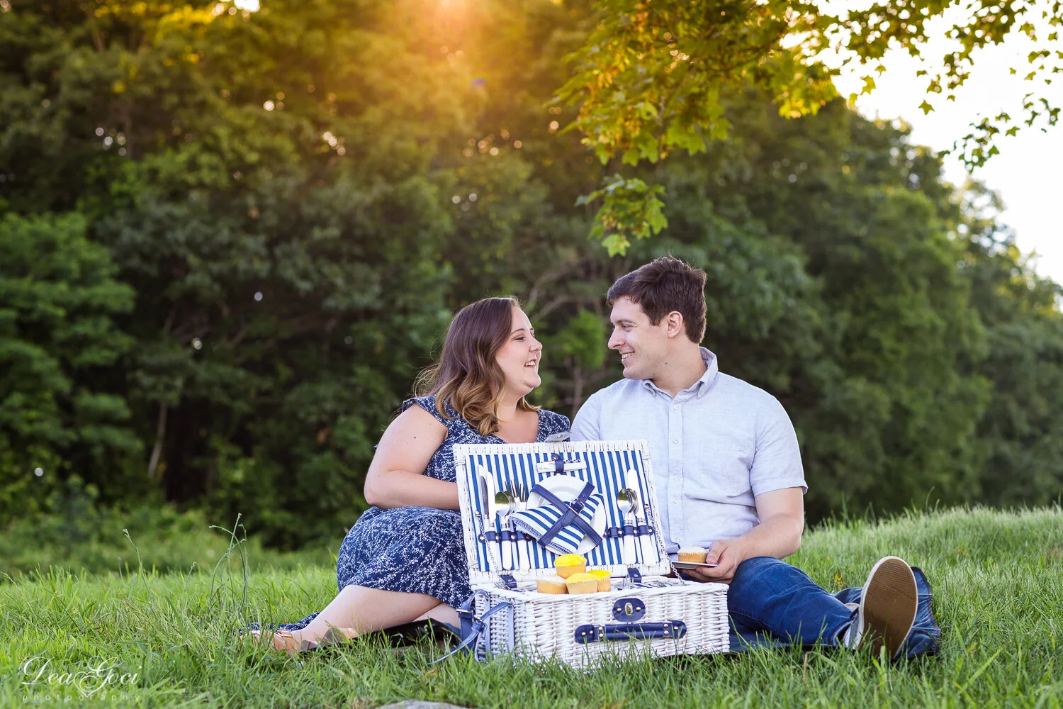 We photographed Ashley and Matt's engagement session at Waterford Beach Park in CT. This location has beautiful grounds to photograph. Besides the beach, there's a rustic bridge, a little pond, woods, tall trees, and rocks. It had downpoured right before we met but then it cleared up and we were blessed with gorgeous golden sunset light. The sky turned cotton candy color by the end of the night and we loved every minute of it. Ashley loves to bake and she brought cupcakes and a picnic basket so they could sit and enjoy a sweet treat during the session. As a bonus, she was even kind enough to leave extra cupcakes that I devoured at the end of the night. This was a fun, relaxed, and creative engagement session.